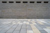 This stock photo features a brick wall next to an empty sidewalk in Berlin, Germany. It is a sunny day with the sunlight reflecting off the windows and squares of tiles. The rectangular brick pattern on the wall adds a touch of urban design and modern architecture to the city. The grey pavement, made of composite materials and paving stones, complements the overall aesthetic. This image perfectly captures the essence of city life in Berlin.