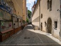 This image captures a view of a classic architecture building in Berlin, Germany. The city's urban design is showcased through the cobblestone alley-way and graffiti wall. The straight road leads to the building with windows and doors. The cloudy sky adds to the urban atmosphere. This photo represents the vibrant city life and architectural beauty of Berlin.
