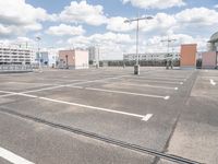 an empty parking lot in a parking lot with two buildings behind it and sky with clouds