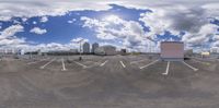 an empty parking lot on a partly cloudy day with a sky background and buildings behind it