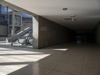 This is an image of Potsdamer Platz in Berlin, Germany. The modern architecture of the buildings and the straight lines of the roads and flooring give the city a contemporary feel. The concrete and tile surfaces create a clean and urban design. In the foreground, there is a subway station entrance with a glass storefront and a hard shadow. The image captures the metropolitan area and the busy city life in Berlin. The composition showcases the infrastructure, columns, and the space filled with shops and lobbies. This photo represents the modernity and urbanity of Berlin in Europe.