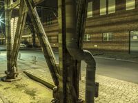 Nighttime in Berlin, Germany. The city's urban landscape is illuminated by streetlights, casting dark shadows on the asphalt road. A tall pipe near a building adds an industrial touch to the scene.