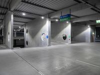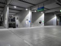 This is an image of a parking garage in Berlin, Germany. The modern architecture of the building is evident with its concrete street and circular holes at the entrance. The silver tiles on the garage floor give it a sleek and contemporary look. The photo was taken at night, creating a dark and atmospheric scene. The urban design of the parking garage blends in with the surrounding cityscape. This image captures the essence of urban architecture and design in Berlin.
