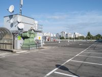 a bus stop is in the middle of a parking lot, where there are several satellite antennas on the side
