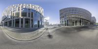 A modern mixed-use building in Berlin's bustling cityscape. The straight road lined with trees leads to the architectural marvel. Sunlight casts long shadows on the monochrome facade. A snapshot of urban life in Germany's vibrant capital.