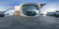 Abstract photo of a modern building in Berlin's city square. Traffic flows on the asphalt road while clouds fill the light blue sky. The building's facade stands out against the landscape, creating a striking contrast.