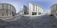 A 360-degree panoramic view of Berlin, Germany. The modern architecture of the city is showcased through the buildings and roads. Cars fill the parking lots, reflecting the bustling business district. A glimpse into the vibrant urban design of Europe's classic architecture.