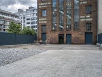 This stock photo depicts a city street in Berlin, Germany. The street is full of cobblestone tiles, giving it a classic and urban feel. A modern building stands next to it, showcasing the city's architecture. The road surface is a combination of brick, dirt, and asphalt. The open space is adorned with trees and vegetation, providing a pleasant atmosphere. The building's windows and brick walls add to the charm. This image captures the essence of city life in Berlin, Europe. It is perfect for illustrating urban design, property, or warehouse concepts. The photo was taken during the day, with clouds adding depth to the sky. The courtyard and public space create a welcoming environment. Whether used for commercial or editorial purposes, this stock photo is sure to enhance any project.