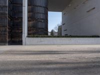 This image captures the modern architecture of a building in Berlin, Germany. The concrete structure showcases clean lines and large windows, complemented by the clear sky and the shadows cast by the sun. The urban setting is represented by the asphalt road surface, while the tree adds a touch of nature to the scene. The gravel and cement wall provide additional texture and visual interest. This photo highlights the architectural beauty and urban atmosphere of Berlin in Europe.