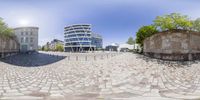 A 360-view of Berlin's circular city street, surrounded by large buildings. Cobblestone road and historic architecture create a charming urban design. Clear sky casts hard shadows, highlighting the city's vibrant city life.