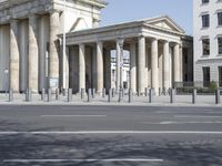 A clear sky illuminates the classic architecture of Berlin, Germany. The iconic Brandenburg Gate stands as a prominent tourist attraction. The ancient Roman columns and grand palace create a stunning cityscape.