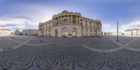 Panoramic view of a classic architecture building in Berlin, Germany. Curved facade and cobblestone road add to the charm of the city. Cars pass by on the asphalt road. A perfect day to explore the city's historic landmarks.