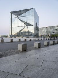 This stock photo features the city of Berlin, Germany at dawn, showcasing its modern architecture and impressive glass skyscrapers. The image captures a view of the city's business district and corporate headquarters, with a clear sky and a surface of asphalt road in the foreground. The buildings' facades are made of glass and concrete, reflecting the urban design and high-rise towers that define the city's skyline. This photo captures the essence of urban life in Berlin, showcasing its bustling city center and the material property of glass as a prominent element of its architecture. It represents the modernity, innovation, and business opportunities that Berlin offers as a European city.