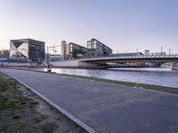 This stock photo features a city street in Berlin, Germany, located in Europe. It shows a beautiful view of a modern architecture cityscape at dawn, with a river in the middle and a concrete bridge crossing over it. The image also includes a bench on the side of the street, creating a serene and urban design. The clear sky and coastal water add to the picturesque scene, making it a perfect representation of city life in the metropolitan area of Berlin.