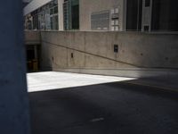 This image showcases an empty parking garage located on the side of a road in Berlin, Germany. The tall buildings lining the street contribute to the architectural beauty of the city. The concrete and asphalt surfaces of the road and parking garage are well-maintained. The facade of the buildings displays various windows, lines, and shadows, creating an interesting visual composition. This photo captures the urban atmosphere of Berlin and represents a typical day in the city. The abstract elements of the image, such as the hard shadows and sloping road, add a unique touch to the composition.