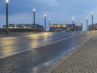 This stock photo depicts a captivating view of Berlin, Germany. The image showcases a walkway adorned with two benches and several street lights, creating a warm and inviting atmosphere during dusk. The modern architecture of the surrounding office buildings adds to the city's urban charm. The wet road surface reflects the artificial lights, giving the scene an enchanting appeal. The image perfectly captures the beauty of Berlin, Europe's thriving business district, and its captivating cityscape.