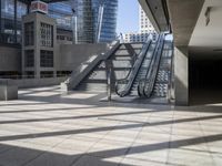 Potsdamer Platz in Berlin showcases modern architecture and urban design. An empty building with large windows and an escalator creates a stark cityscape. Concrete surfaces and metal handrails cast hard shadows in the day.