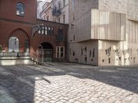 This image captures the urban charm of Berlin, Germany. The brick walkway, flanked by two red brick buildings, leads to a quaint courtyard. The steps and doorway add to the architectural appeal of the scene. The cobblestone surface and the open space create a vibrant public area in the heart of the city. This photo represents the city life and urban design of Berlin and showcases the unique charm of its buildings and public spaces.