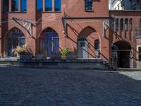 Urban architecture in Berlin's courtyard. Classic brick walls and cobblestone paths create a quintessential European city scene. Hard shadows play on the surface of warehouses and storerooms.