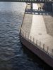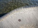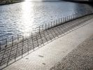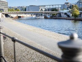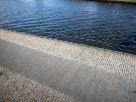Aerial view of Berlin's coastal area, with a high-rise circular building and a body of water. The sunlight casts a shadow over the concrete walkway and the straight road leading to the horizon. A perfect blend of urban and natural elements.