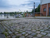 A picturesque pier in Berlin, Germany. The cobblestone surface leads to an open space with stunning views of the coastal skyline. Clouds hang above the pier, creating a tranquil atmosphere. Explore the European charm of Berlin's harbor.