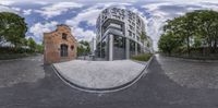 two 360 - views of an urban area including buildings with arches on it, a tree line, and a street with bricks and pavement