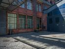 Classic European architecture in Berlin. Cobblestone roads lead through city life with warehouses and factories. Hard shadows line urban streets. Open spaces contrast with dense city vegetation under a clear European sky.