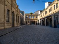 A classic Berlin cityscape with straight cobblestone roads and classic architecture. The clear sky casts hard shadows on the urban landscape. Historic brick walls frame the business district, with warehouses and storage facilities in the courtyard.