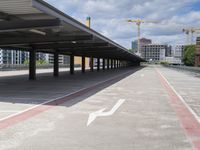 empty parking lot on concrete next to tall building with cranes in distance and buildings across the street