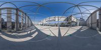 a fish - eye lens captures a curved walkway, a structure with arches and pillars on both sides