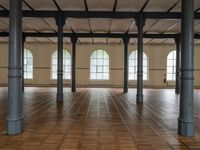 A classic architecture warehouse in Berlin with straight roads leading to it. The profile of the building stands tall against the clear sky. Inside, dancers are rehearsing their ballet routines.