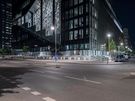 A stunning night view of Berlin's modern architecture and cityscape. The city's financial district shines with artificial light, while people walk along the streets and walkways. The clear sky adds to the enchanting atmosphere.