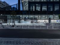 a street has several white concrete poles by it at night, and in the center is some glass, with glass and some greenery in front