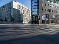 A view of a modern office building in Berlin's financial district. The clear sky casts hard shadows on the city streets, highlighting the urban architecture. The reflection of the traffic lights adds to the vibrant city life.