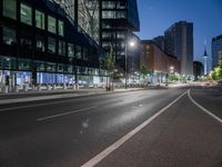 A stunning cityscape of Berlin's financial district at night. The modern architecture and high-rise buildings are illuminated by artificial lights, creating a vibrant and dynamic atmosphere. The clear sky complements the urban design, while the streets and roads are lined with trees and vegetation.