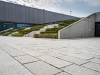 A modern courtyard in Berlin's financial district. The open space features a grand staircase surrounded by lush vegetation. The architectural design and business district atmosphere make it the perfect location for conferences and events.