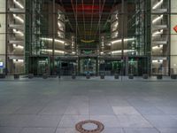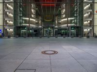 Futuristic architecture in Europe: Berlin's urban design features modern glass walls illuminated by artificial light at night. The city's profile comes alive with unique surfaces and open spaces.