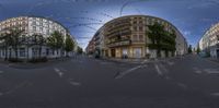 An aerial view of a road in Berlin, Germany. Classic and modern architecture line the urban landscape. The city's design showcases both residential and commercial buildings. Shadows cast hard contrasts on the asphalt below.