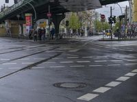 An urban intersection in Berlin, Germany. Architectural marvels line the streets, while a bridge spans over the underpass. The city's urban design is showcased by the absence of sidewalks. A wet road surface contrasts with cloudy skies.