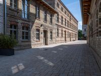 This is an image of a classic architecture building in Berlin, Germany. The brick wall and courtyard add to the urban design of the city. The clear sky above and the bustling city life below create a vibrant atmosphere. This photo showcases the juxtaposition of old and new, with the historic architecture and the modern urban setting. The surface of the brick wall and the brick alley-way suggest a rich history. Berlin is known for its architecture, museums, and hotels, making this image a great representation of the city's charm.