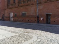 Urban scene in Berlin, Germany. A man stands on the sidewalk in front of a brick building with a 'no parking' sign. Cobblestone road surface and open courtyard add to the charm of this European city.