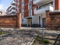 A brick patio in a courtyard in Berlin, Germany. Adjacent to a tall building with balconies, showcasing modern architecture. The clear sky contrasts with the urban design of the neighborhood.