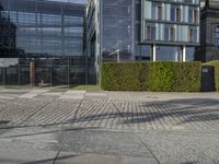 A clear sky over Berlin showcases the modern architecture of the city. Residential buildings with unique facades line the streets, creating a dynamic urban design. The business district features office buildings and public spaces, surrounded by trees and grass.