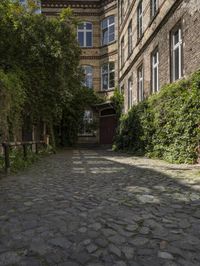 This image captures the charm of an alley in Berlin, Germany. The cobblestone paving leads the way down the road, lined with residential buildings showcasing classic architecture. The two large windows and one door add character to the facade. Towering trees stand in front, adding a touch of nature to the urban setting. The photo encapsulates the essence of city life and the unique urban design found in Berlin. The surface of the road and courtyard are well-preserved, reflecting the care put into maintaining this European residential area. Step into the Hinterhof and experience the beauty of Berlin's architecture.