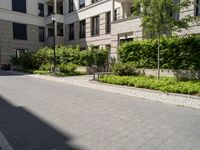 A modern residential area in Berlin, Germany. The architecture blends with the urban design, featuring buildings with large windows and hard shadows. Cobblestone streets and lush vegetation add to the charm of city life in Europe.