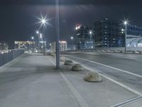 the empty city road is empty by the tall building in the background at night with light streaking on the buildings