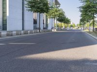 A person skateboarding on a city street in Berlin, Germany. Modern architecture and office buildings line the road. Trees frame the scene against the blue sky, showcasing the urban design of Europe's business district.