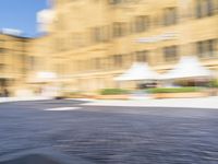 Dynamic motion blur of a fast drive through the streets of Berlin, Germany. The urban landscape showcases a mix of cobblestone roads, open spaces, and modern buildings. Reflections on the road surface add a touch of urban design.