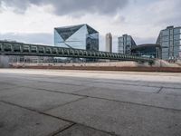 A view of the cityscape of Berlin, Germany. Modern architecture and urban design dominate the scene. Clear sky contrasts with the cloudy backdrop. Busy city streets and a bridge add to the urban atmosphere of the European city.