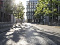 This is an image of a straight road in Berlin, Germany. The modern architecture of the office buildings lines the street, casting shadows in the afternoon sunlight. The clear sky overhead adds to the vibrant cityscape. This urban neighborhood is a hub of business and city life. The tree-lined road and public spaces offer a pleasant escape from the hustle and bustle. This photo captures the essence of urban design and European city living.